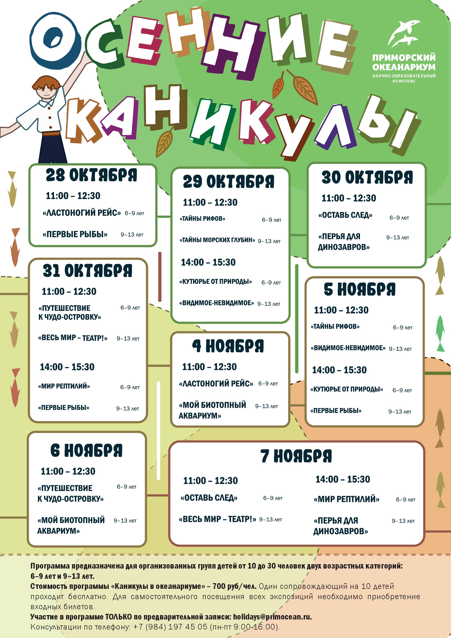 Билеты на каникулярные программы приобретаются только в кассах океанариума и не позднее, чем за 30 минут до начала.