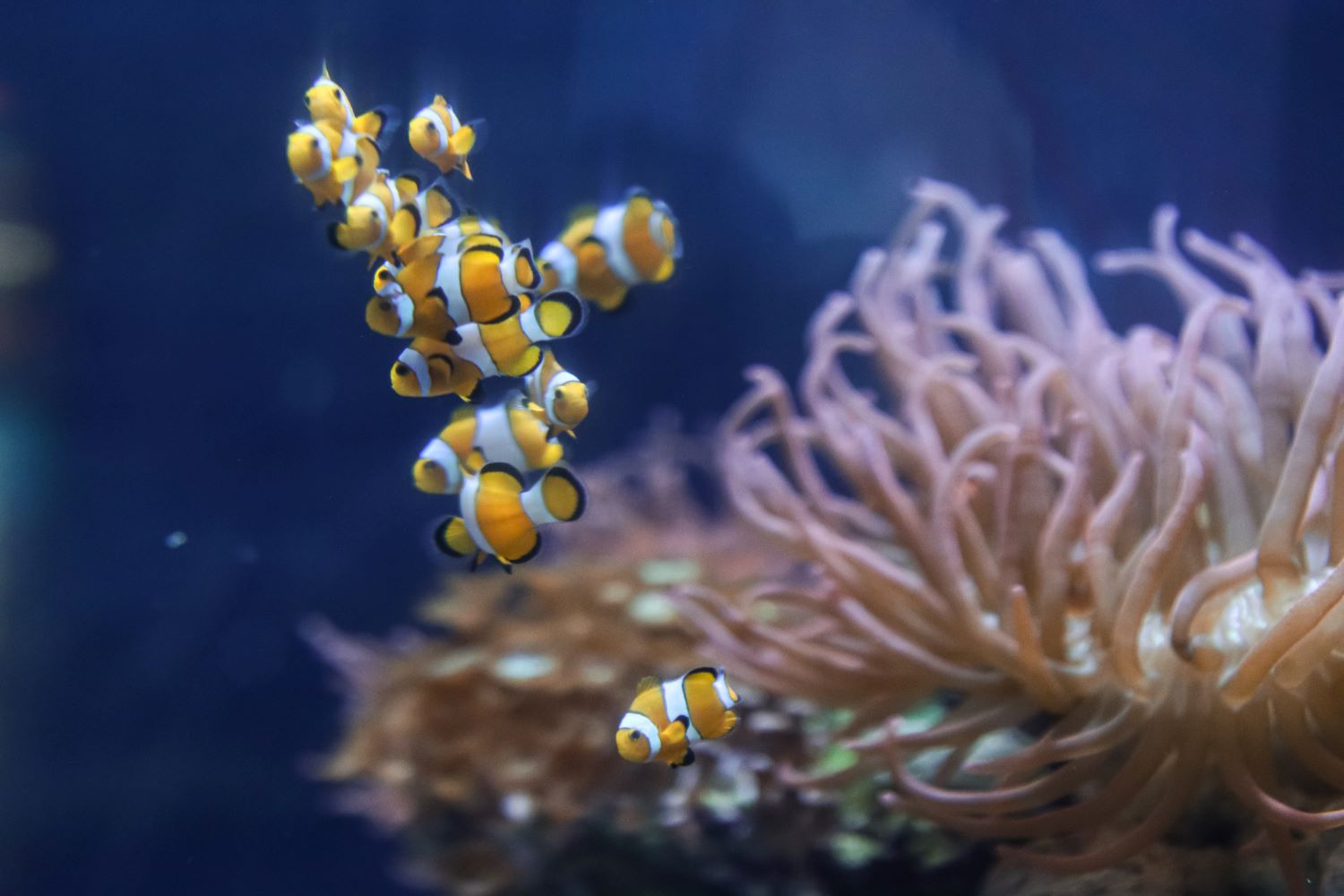 В экспозиции «Тропические моря» очередное обновление: в большом цилиндрическом аквариуме, где из подводных пещер выглядывают узорчатые змееподобные тела и зубастые пасти звёздчатых мурен Echidna nebulosi, поселилась живописная стайка мелких клоунов оцелларис Amphiprion ocellaris. Более десятка ярких рыб "облачком" собираются над своими симбионтами-актиниями.