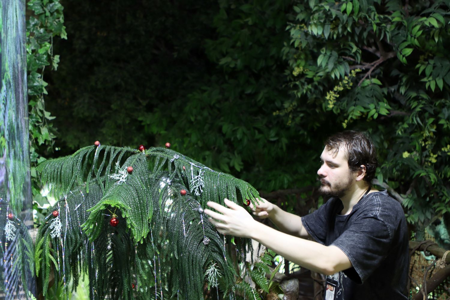 Специалисты отдела «Тропический лес» тоже захотели подарить гостям «вечнозелёной» экспозиции праздничные эмоции. В качестве необычного новогоднего символа они решили использовать маленькую араукарию разнолистную Araucaria heterophylla, которую все уже привыкли видеть в композиции «Живые реликты» напротив фитостены эпифитов.  Теперь это деревце расцветили красные, в честь наступающего года Огненной Лошади, шарики, серебряные снежинки и переливающийся всеми цветами радуги «дождик». Пусть эта экзотическая красавица и не вышла ростом, но она живая и пахнет хвоей, как самая настоящая ель.