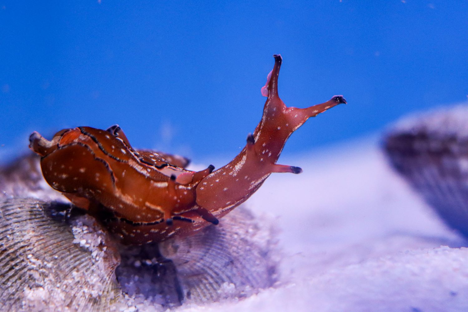 В экспозиции «Японское (Восточное) море», в небольшом аквариуме с белой кукумарией поселились ещё трое необычных жильцов. Это — заднежаберные брюхоногие моллюски аплизии карликовые Aplysia parvula, среди аквариумистов получившие название «карликовые морские зайцы».