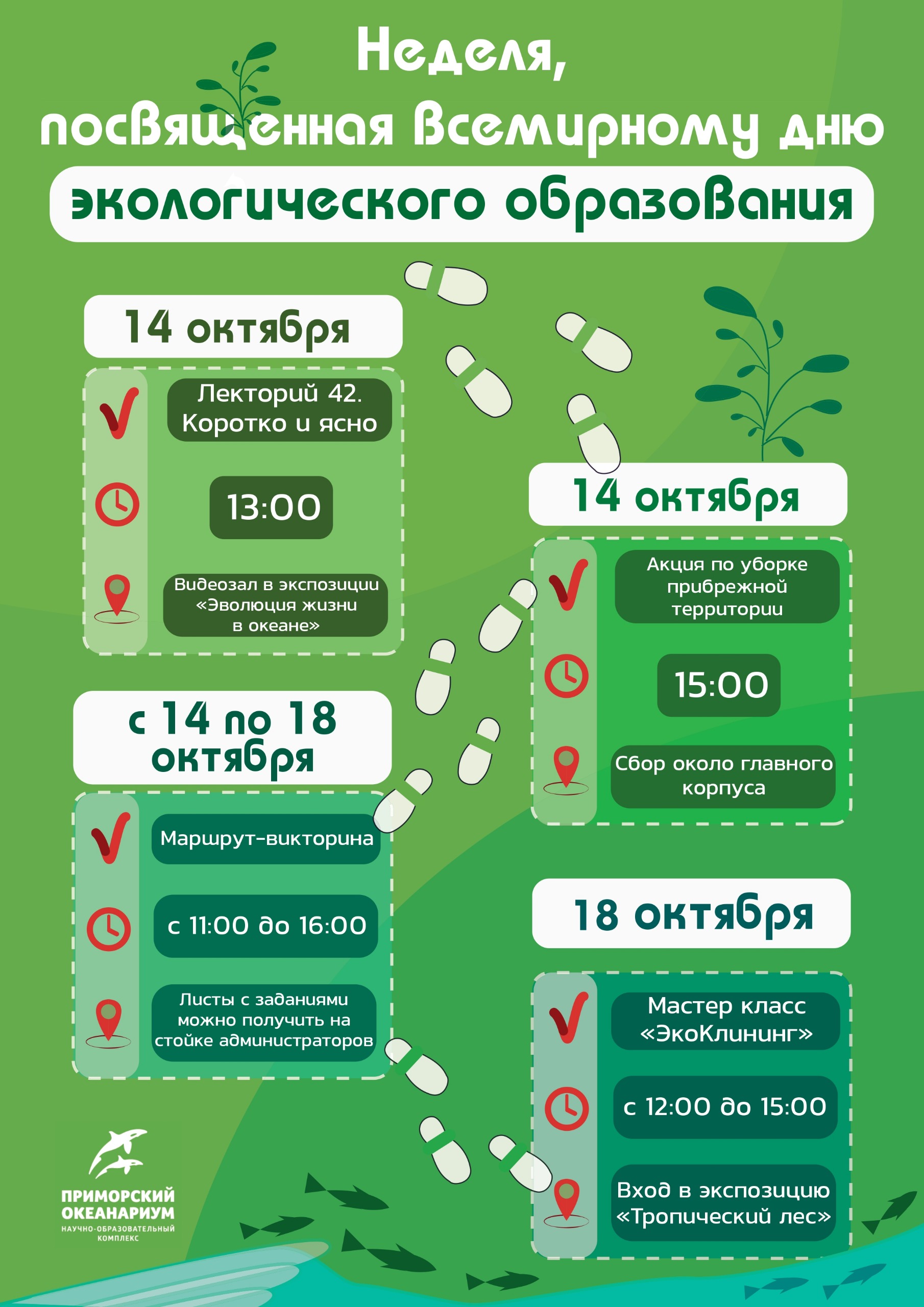 На следующей неделе, с 14 по 18 октября, в Приморском океанариуме посетителей ждёт насыщенная программа, посвящённая Международному дню экологического образования.