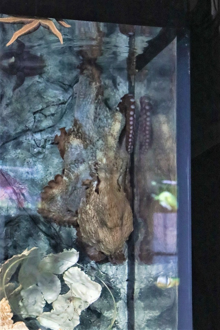 Посмотреть на головоногих умников можно в зале осьминогов экспозиции «Японское (Восточное) море», в прямоугольном аквариуме которого обитает любительница побегов, играющая со звёздами.