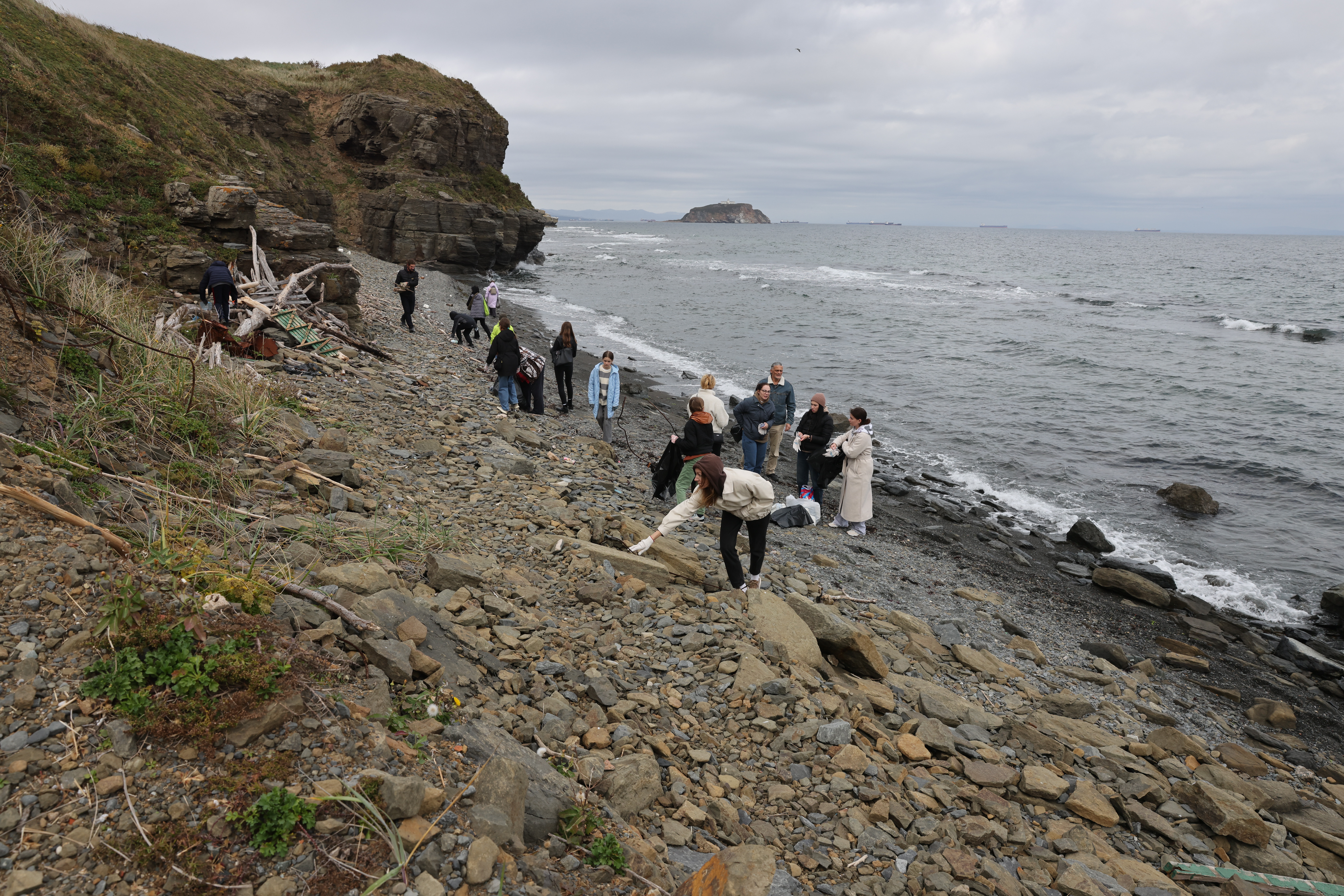 Подобные экологические субботники проводятся дважды в год: весной и осенью. На этот раз мероприятие было приурочено ко Всемирному дню экологического образования. Место сбора неизменно – это участок берега в районе водозабора Приморского океанариума, расположенного у мыса Каразина. В силу особенностей местной гидрологии течениями здесь постоянно выносится на берег большое количество различного мусора. Вооружившись рабочим инвентарём, юные участники ступеней «Моржи» и «Планета Юнатариум» просветительского проекта «Растём в океанариуме» и их родители принялись за дело.