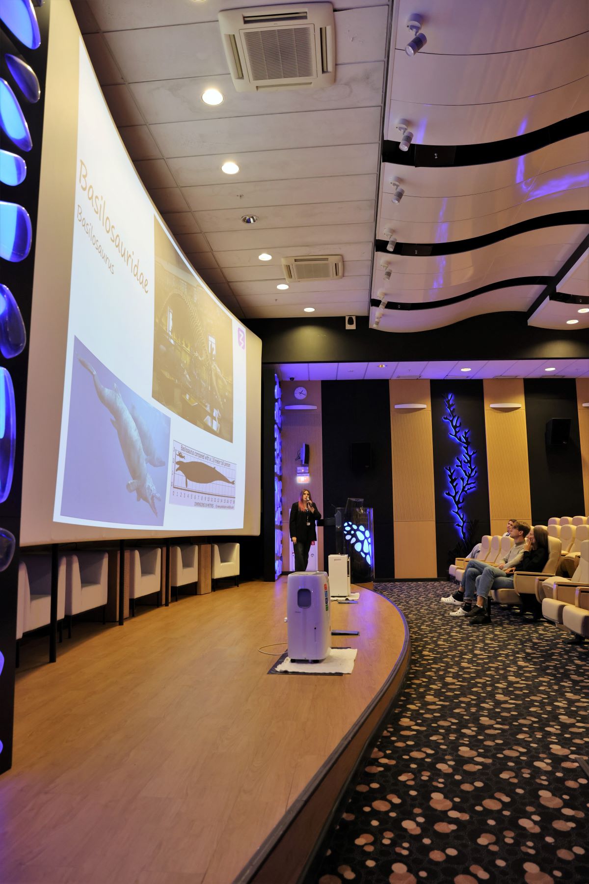 В конференц-зале Приморского океанариума начальник отдела просвещения Екатерина Раевская рассказала собравшимся о происхождении китообразных. Посетители с удивлением узнали, что ископаемый индохий Indohyus размером с кошку — прямой родственник современных морских гигантов. Большой интерес у слушателей вызвала также художественная реконструкция облика разнообразных животных — «ступеней» длинной эволюционной лестницы китообразных. В своей следующей лекции специалист рассказала о птицах дальневосточной тайги и о том, какие препятствия приходится преодолевать учёным, чтобы наблюдать за их жизнью, скрытой от посторонних глаз.