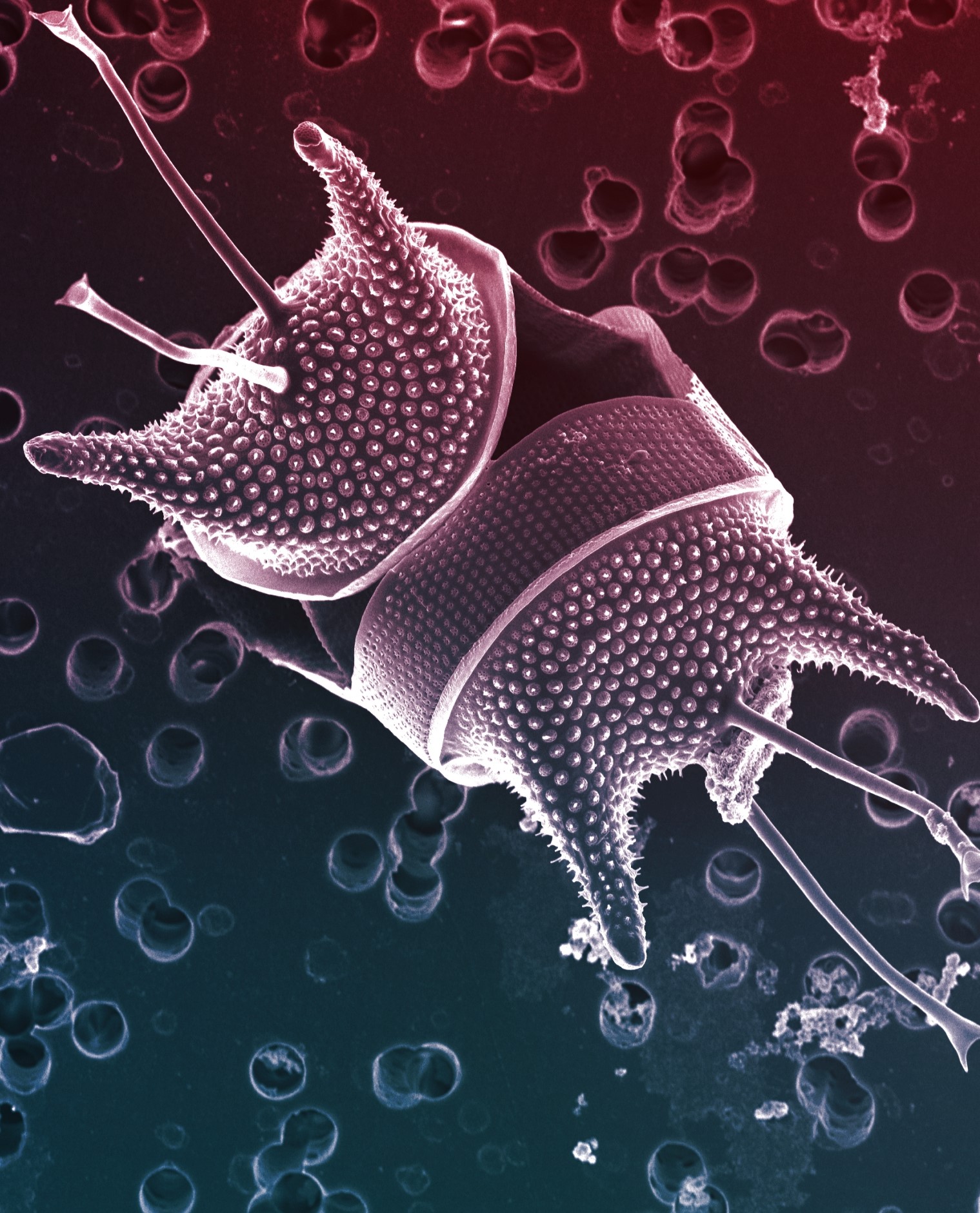 В Приморском океанариуме изучением этих представителей микромира занимается одно из подразделений центра коллективного пользования (ЦКП) — лаборатория биотехнологии морских микроводорослей. Её научный руководитель, к.б.н. Мария Шульгина, поделилась фотографиями объектов исследования: типичных видов фитопланктона залива Петра Великого, принадлежащих к группе диатомей. Диатомеи отличаются от других микроводорослей наличием у растительных клеток кремниевого «панциря», придающего им сложную причудливую форму. На снимках они напоминают ювелирные украшения: ожерелья, браслеты, драгоценные броши. Настоящим произведением искусства выглядит фотография одонтеллы золотистой Odontella aurita под сканирующим электронным микроскопом — здесь она увеличена в 8000 раз!