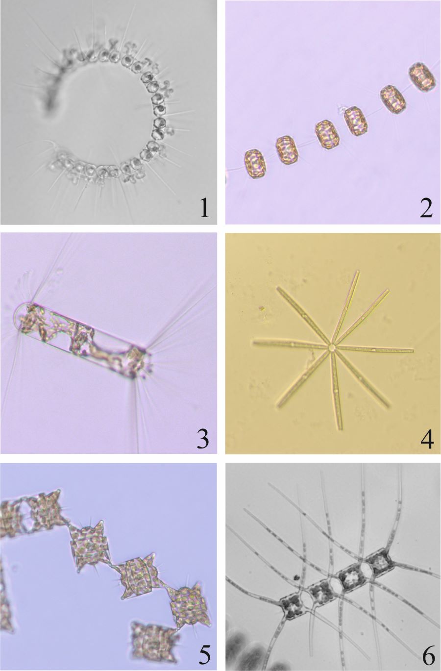 Типичные виды фитопланктона залива Петра Великого: 1-Chaetoceros debilis; 2-Thalassiosira nordenskioeldii; 3-Corethron criophilum; 4-Thalassionema nitzschioides; 5-Odontella aurita; 6-Chaetoceros atlanticus