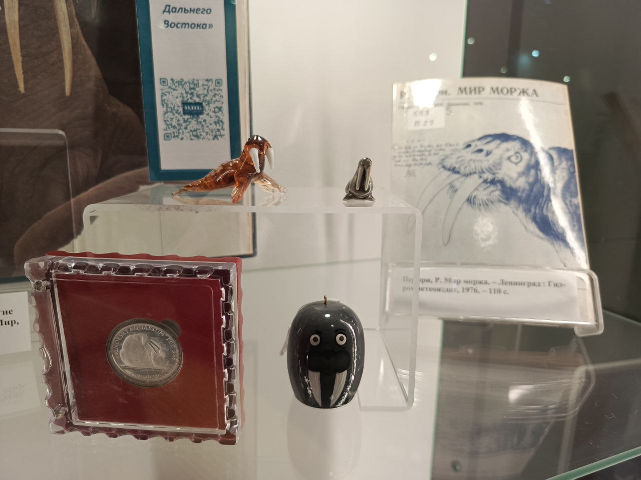 Помимо печатной продукции, на полках расположились многочисленные сувениры из личной коллекции Владимира Маслова, тренера морских млекопитающих Приморского океанариума: стеклянные, деревянные и пластиковые фигурки моржей. Есть одна, изготовленная из ракушек, а другая изображает этого морского зверя в виде Будды.