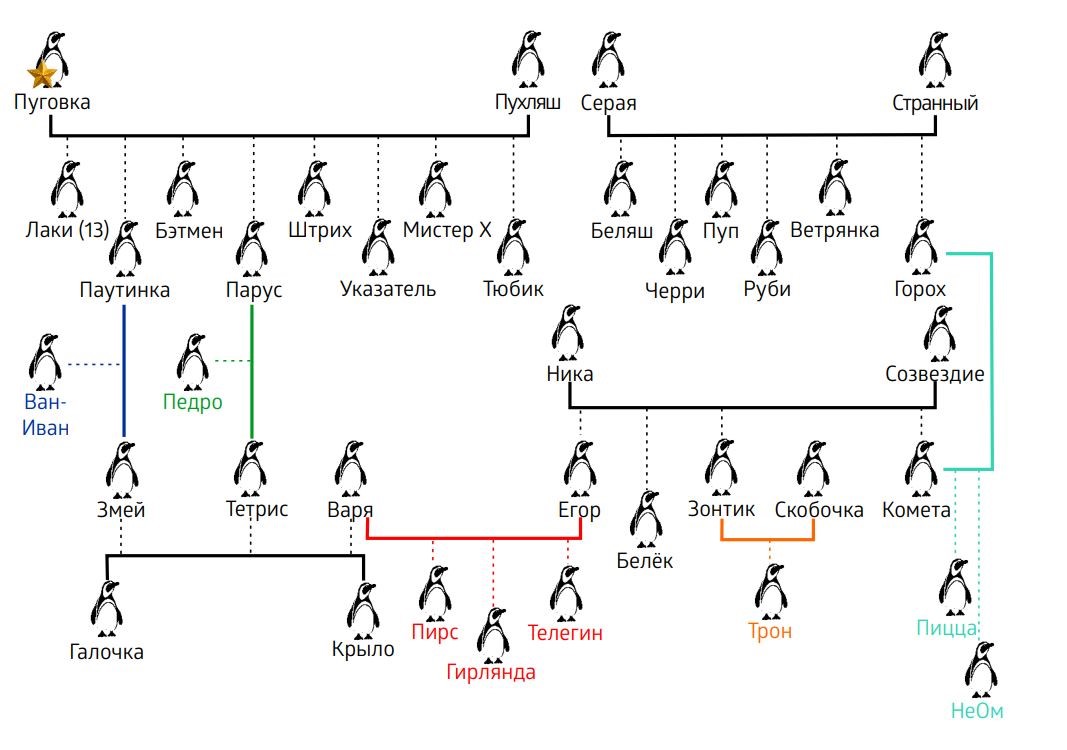 Каждый из обитателей пингвиньего вольера в экспозиции «Полярный мир» имеет свой «паспорт» — этикетку со схемой родства. Сплошные квадратные скобки соединяют родительские пары, а отходящие от скобок пунктирные линии указывают на потомство. Цветными скобками обозначены пары, состоящие из пингвинов, появившихся на свет уже в стенах Приморского океанариума.
